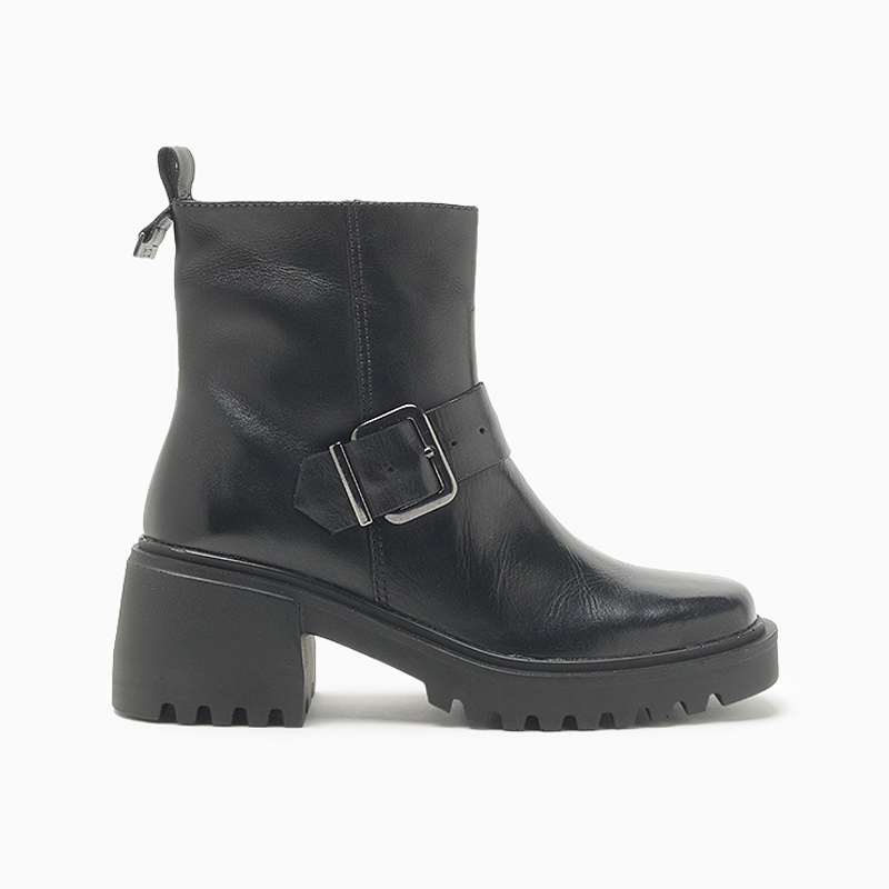 La bota Hush Puppies Mia color negro está confeccionada en cuero y presenta aplique de hebilla metálica en el perfil y ornamento metálico en el talón con grabado de la marca. Cuenta con plantilla forrada en material sintético con identificación de la marca en alto relieve y fondo de material sintético soft con taco y plataforma. La altura del taco es de 6 cm.