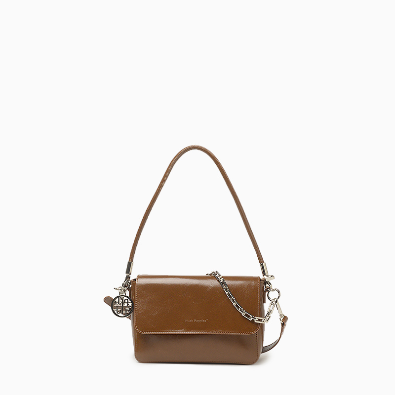 La bandolera Hush Puppies Salla color marrón presenta un diseño rectangular confeccionado en material sintético blando con acabado brilloso y vetas que emulan el cuero natural. Su acceso es mediante tapa con botón imán. Incluye tres correas desmontables que permiten llevarla como bandolera, cartera al hombro o de mano. La correa de cadena metálica posee holograma personalizado de la marca. En su interior lleva un compartimiento de tela con cierre. Medidas: alto 16 cm, ancho 22 cm y profundidad 7 cm.