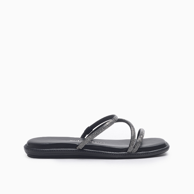La Sandalia Apie Amy II color negro está confeccionada en cuero vacuno con diseño mule de multitiras adornadas con apliques de strass que aportan brillo y sofisticación. Incorpora plantilla acolchada confort con punta cuadrada e identificación de la marca en alto relieve, mientras que su suelín de goma antideslizante garantiza seguridad al caminar. La altura total es de 1,5 cm.