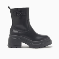 La bota Hush Puppies Alex color negro presenta capellada en cuero con elástico en el lado interno y externo que favorece el calce y la adaptación al pie, combinada con fondo de goma antideslizante con efecto gastado que aporta carácter y estabilidad. Incorpora tira de cuero en el talón para facilitar el acceso y aplique metálico con identificación Hush Puppies en el perfil como detalle distintivo de marca. Su diseño de caña corta alcanza una altura de 12,5 cm y cuenta con taco de 7,5 cm de altura total, logrando una silueta estilizada con construcción liviana pensada para el uso diario.