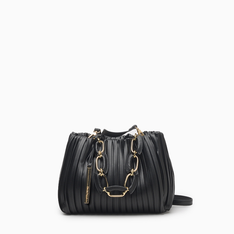 La Cartera Hush Puppies Derval color negro está confeccionada en cuero sintético con efecto plisado vertical que aporta textura y estilo. Presenta botón imantado metálico y un doble sistema de asas: una correa larga regulable y desmontable para usar al hombro o cruzada, y una cadena decorativa con eslabones metálicos dorados combinados con tramos en cuero ecológico. Sus avíos metálicos dorados personalizados y el charm metálico añaden un detalle distintivo. De estructura flexible con base reforzada, ofrece un interior amplio pensado para el uso diario. Sus dimensiones son 26,5 cm de ancho, 22 cm de alto y 10 cm de profundidad.