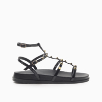 La Sandalia Hush Puppies Cecile color negro está confeccionada en cuero charol con diseño de múltiples tiras y apliques de tachas metalizadas piramidales que realzan su estilo. La plantilla forrada en material sintético al tono de la capellada lleva la identificación de la marca, mientras que el suelín de goma antideslizante asegura tracción y estabilidad. La altura total es de 1 cm.
