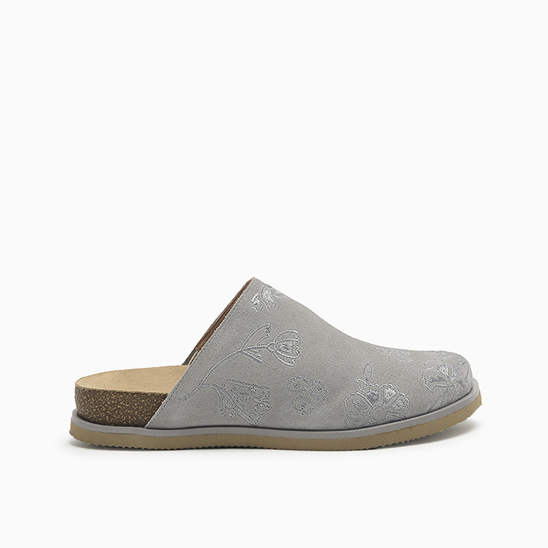 El Zueco Hush Puppies New Woomy color gris está confeccionado en cuero descarne y presenta un delicado bordado de flores al tono de la capellada, aportando un estilo artesanal y femenino. Incorpora plantilla símil corcho forrada en microfibra suede con identificación de la marca, que brinda una pisada confortable y agradable al contacto con el pie. Su suelín de EVA liviano acompaña el andar diario con estabilidad, y cuenta con una altura total de 1 cm, ideal para un uso relajado y cómodo.