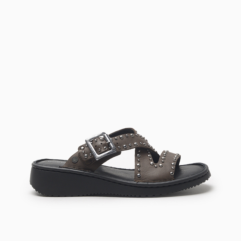 La Sandalia Hush Puppies Anvard color marrón presenta un diseño de tiras cruzadas con apliques de hebillas metálicas circulares y hebilla en el perfil, que aportan carácter y estilo. Su plantilla está forrada en cuero e incluye la identificación de la marca, brindando una pisada confortable y de calidad. El fondo de material sintético completa el diseño con una altura total de 4,5 cm, ideal para sumar comodidad y estabilidad en el uso diario.