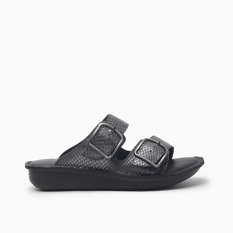 Las sandalias Hush Puppies Shane en color negro combinan elegancia y confort con su diseño en cuero fantasía y doble hebilla que aporta estilo y un ajuste personalizado. La plantilla de cuero, diseñada para ofrecer una comodidad superior, proporciona una experiencia de uso agradable durante todo el día. El fondo de material sintético tiene una altura total de 2,5 cm, ofreciendo una pisada estable y cómoda, lo que las convierte en una excelente opción para el uso diario con un toque de sofisticación.