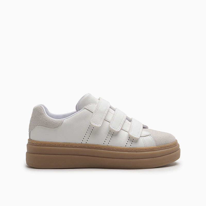 La Zapatilla Hush Puppies On color blanco confeccionada en cuero y descarne, con tres velcros que facilitan el ajuste y detalles de pequeñas perforaciones en el perfil que aportan frescura y estilo. La identificación de la marca se encuentra en la lengua y el talón. Incorpora una plantilla de material sintético con logo y una suela de goma antideslizante con una altura total de 4,2 cm que brinda estabilidad y comodidad en cada paso.