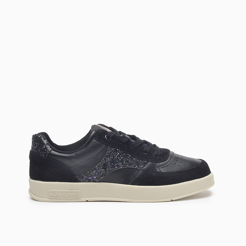 Zapatilla Hush Puppies Dido en color negro, acordonada en cuero, cuero descarne y glitter. Este modelo presenta un diseño moderno con detalles de glitter en el lateral, lo que le da un toque único y elegante. La plantilla de material sintético (PU) es súper cómoda, brindando soporte y confort, mientras que el fondo de material antideslizante asegura estabilidad y durabilidad en cada paso. Además, la etiqueta cosida en la lengua lleva la identificación de la marca. Su suela, de estilo deportivo y con diseño limpio, complementa perfectamente su estética, ideal para quienes buscan un calzado cómodo y con estilo.